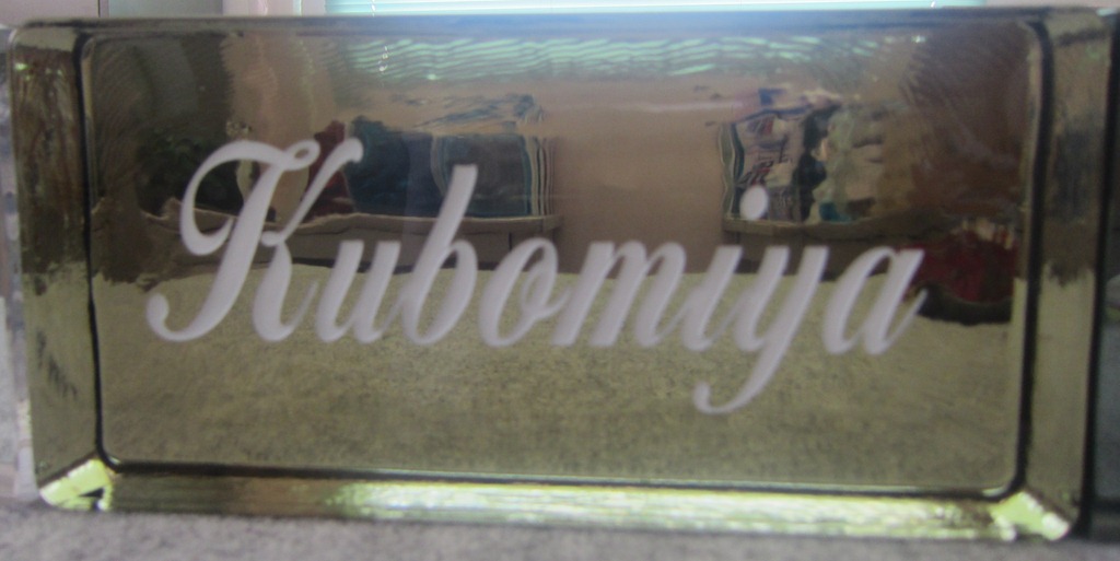レンガサイズのベネチアンガラスの側面を彫り積みあげるサインです、ベネチアンカセラスの中を光が透過しているのが良くわかると思います、厚みのあるガラスに光が透過すると魅力ある雰囲気を醸し出します。