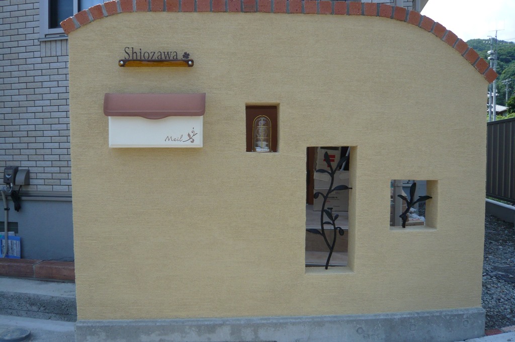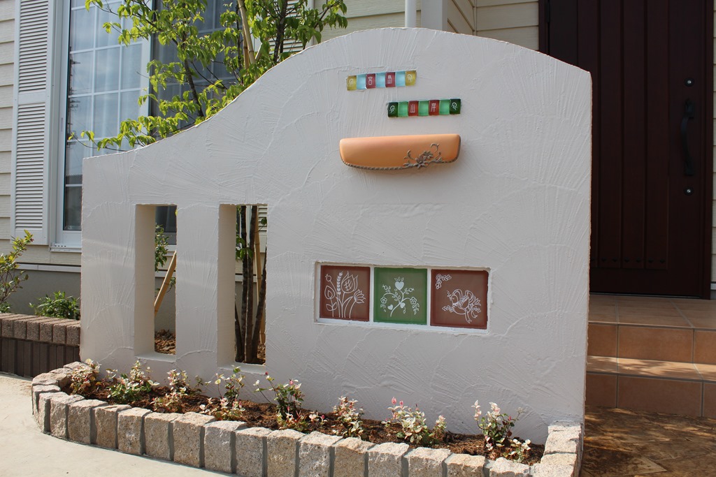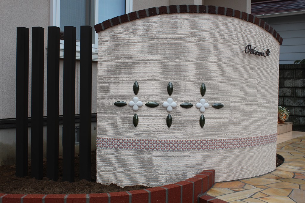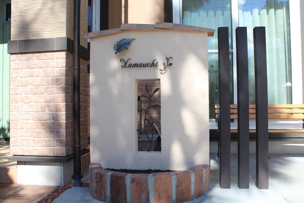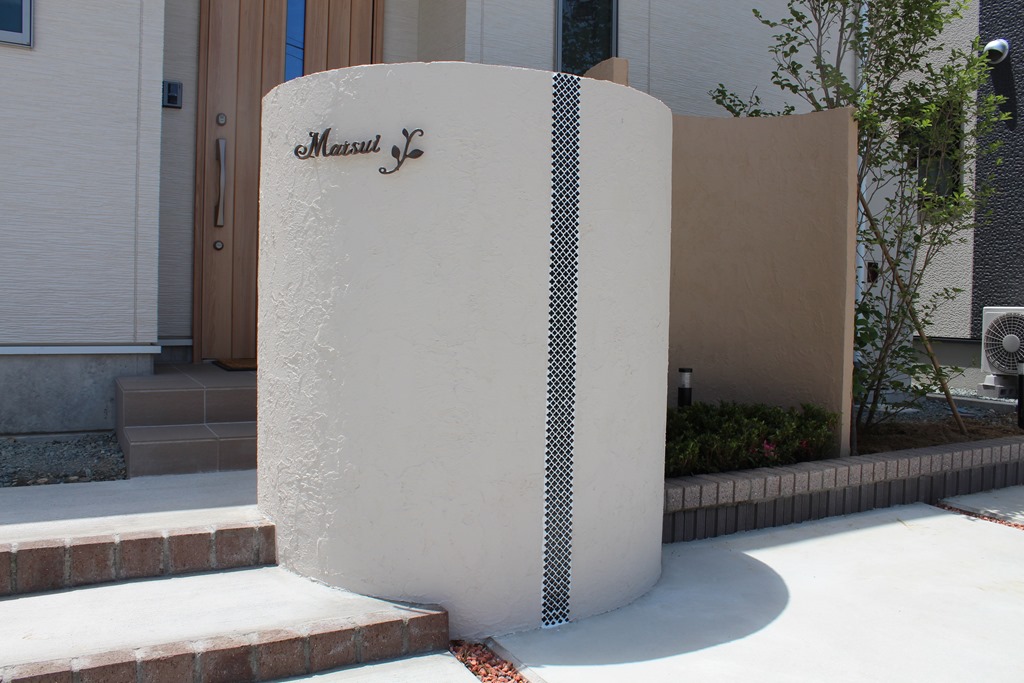 女性に人気の曲線を描いて作るエクステリアの門柱。洋風の建物にとてもよく似合い、バランスの取れたデザインになります。塗り壁の中に好みのエクステリアアイテムを使ってオンリーワンの門柱を作る事ができます。