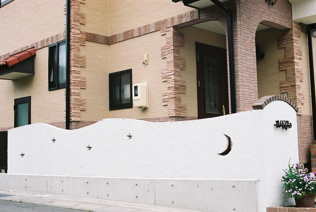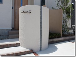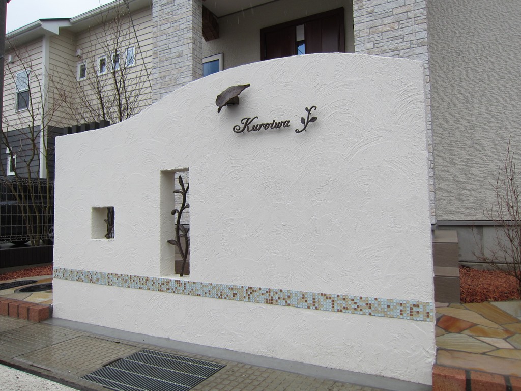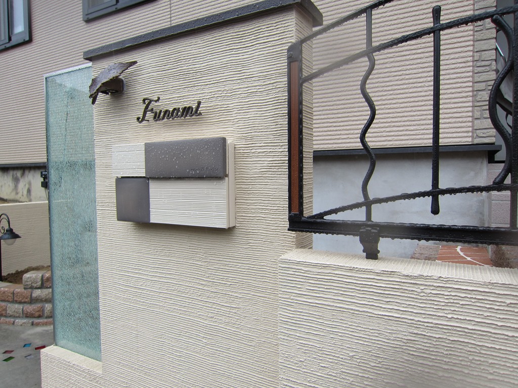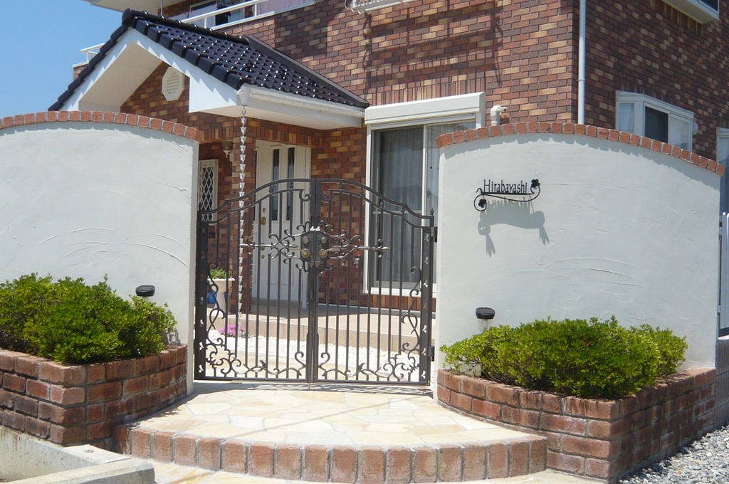 女性に人気の曲線を描いて作るエクステリアの門柱。洋風の建物にとてもよく似合い、バランスの取れたデザインになります。塗り壁の中に好みのエクステリアアイテムを使ってオンリーワンの門柱を作る事ができます。