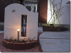 緩やかな曲線の門柱は、ガーデンポールライトの光の影を優しく映してくれています。灯りの影が魅力あるデザインに見えてきます。門柱の横に立てられたポールへと続く長い花壇に照明を幾つも付けて明るくしています。