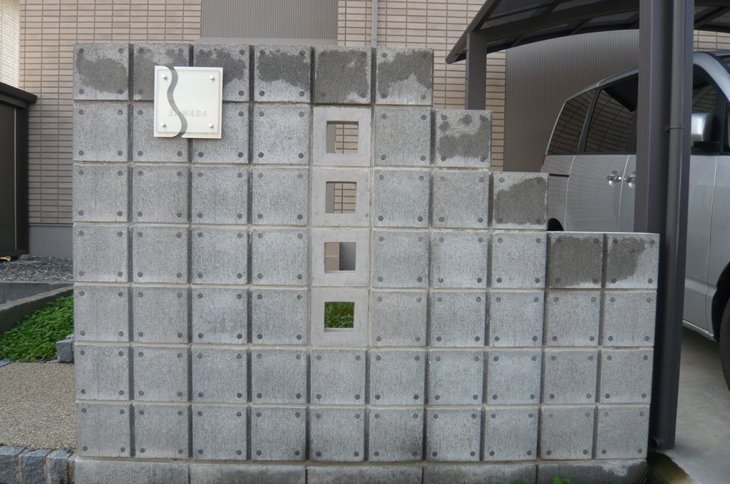 化粧ブロックを積み上げて作られたエクステリアの門柱です。施工が他の工法に比べると早いのも特徴のひとつです。