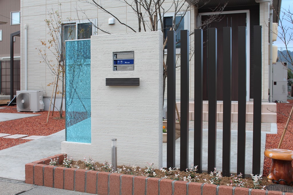 ジュエルグラスを組み込んだエクステリア門柱は、当社オリジナルできらきら輝くガラスパネルが人気です。