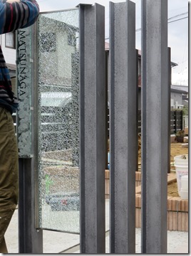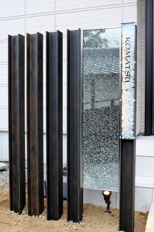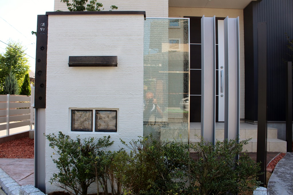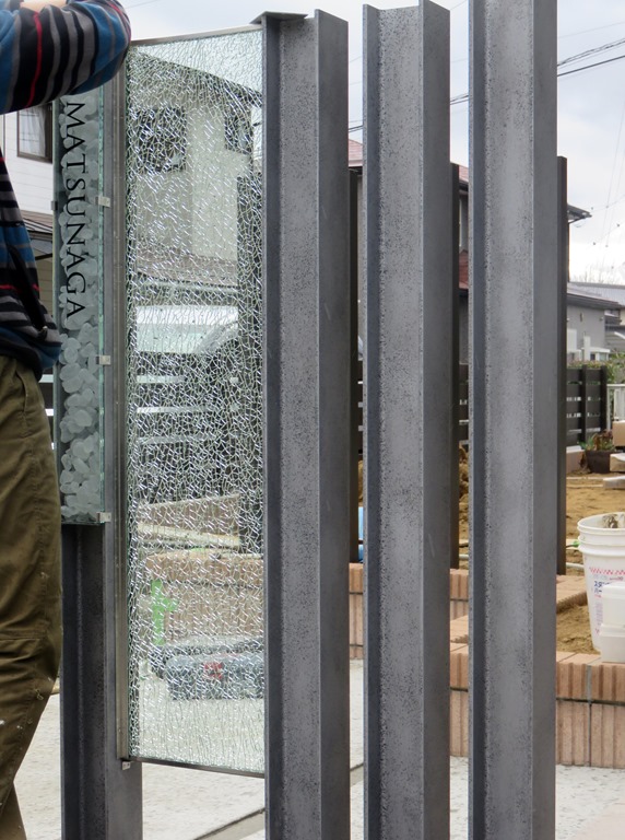 お客様と打ち合せをしていて、オンリーワン(他に無い)の門柱を作りたいと考えている人が多い事に気づきます。 どんなに素敵な門柱であっても、自分の家の近くに同じデザインがあるとガツカリしてしまうのではないでしょうか。当社は常にエクステリアに新しいアイテムが出来ないものかと考えています。メーカーのカタログから選ぶのではなく、新しいエクステリアのものづくりにチャレンジしています。 H鋼を使用した門柱も当社オリジナルの門柱で今までに使用されていない外構施工の方法です。H鋼にオリジナルサイン伊尚&ジュエルグラスはシンプルでおしゃれな門柱です。